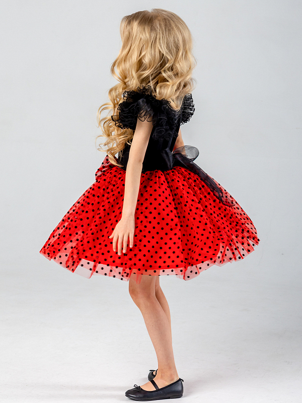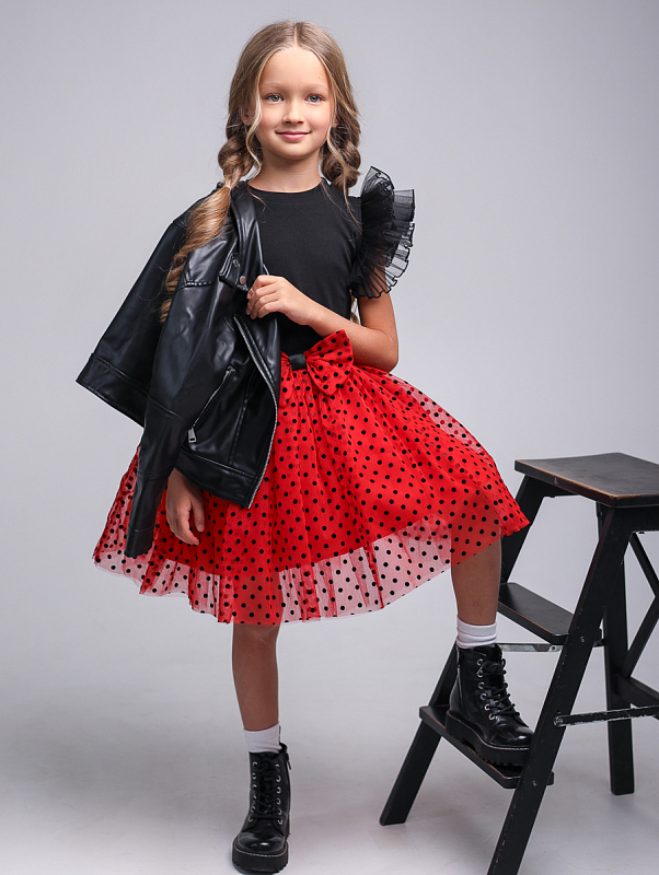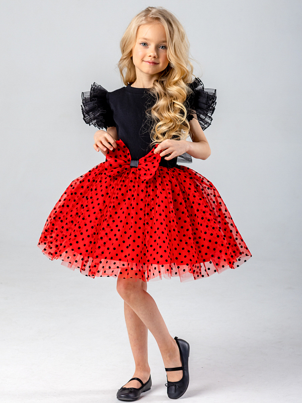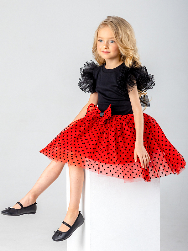 Верхняя ткань юбки - сетка в горошек из флока, внизу 2 слоя фатина для пышности, к телу - подкладка.