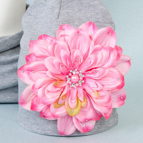 Шапочка украшена большим, эффектным георгином. В серединке и на лепестках цветок декорирован стразами и жемчужинками.