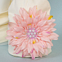 Шапочка украшена большим, эффектным георгином. В серединке и на лепестках цветок декорирован крупными стразами и жемчужинками.