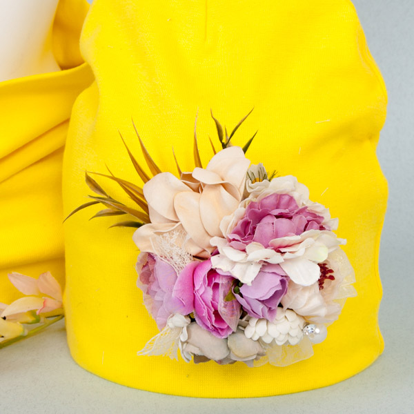 Шапочку украшает необыкновенно красивый букет, который с легкостью можно снять для стирки изделия.
