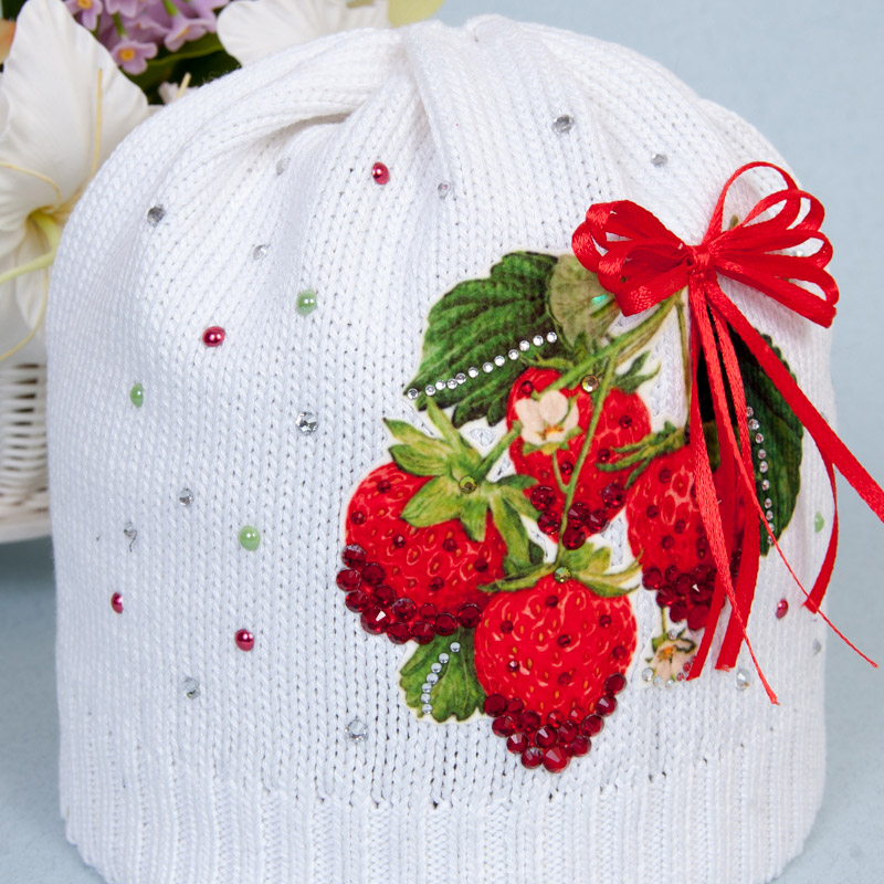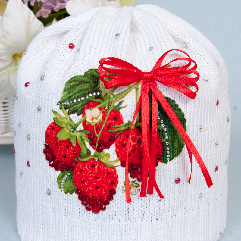 Шапочка необыкновенно красивая и яркая, украшена эффектными клубничками и вся усыпана стразами. Дополнительное очарование добавляет объемный бант из атласных лент красного цвета.