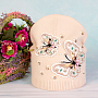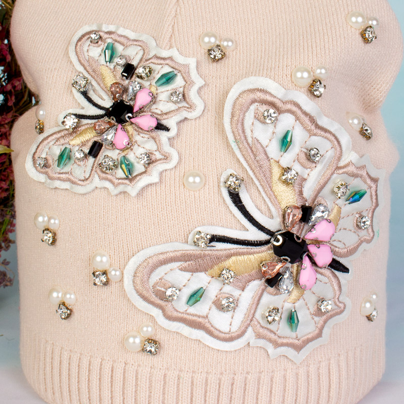Шапочку украшают большие бабочки. Дизайн декорирован камнями и жемчужинками.