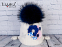 Шапочка украшена сине-розовой, стильной композицией из цветов ручной работы и надписью Laura сбоку.
