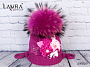 Шапочка украшена стильной композицией из цветов ручной работы в розовом цвете и надписью Laura сбоку.