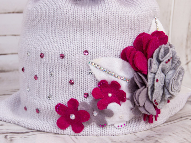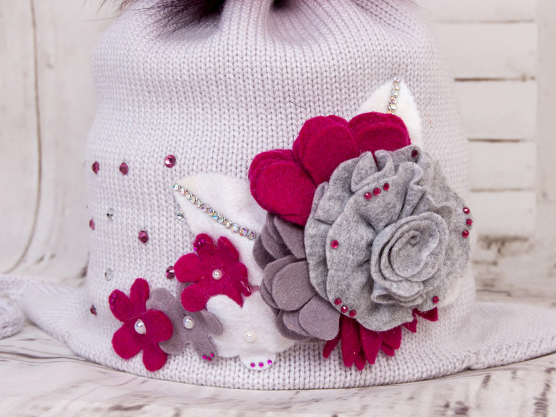 Шапочка украшена шикарной композицией из фетровых цветов и крупных страз.