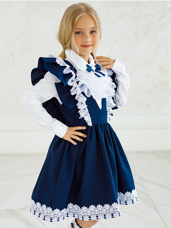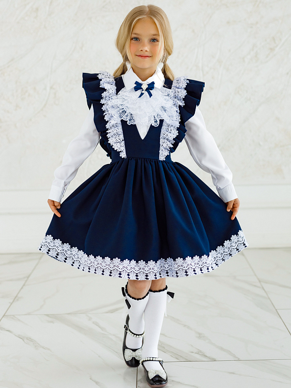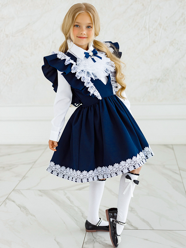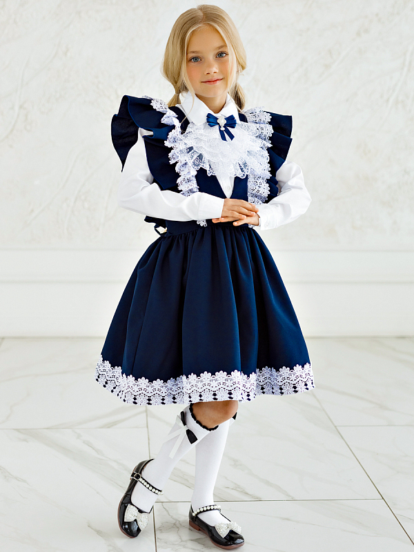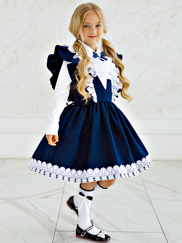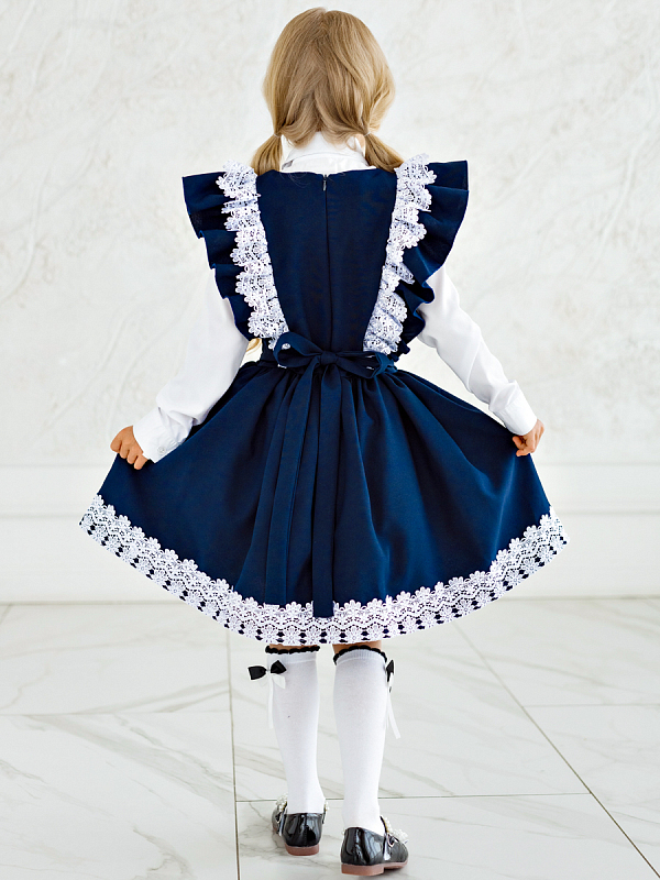 К сарафану можно заказать белый подъюбник из фатина для пышности (артикул 2700092) или темно-синий подъюбник на каждый день, который не виден снизу (артикул 2100032). С ним сарафан будет смотреться нарядней. На фото сарафан с подъюбником.
